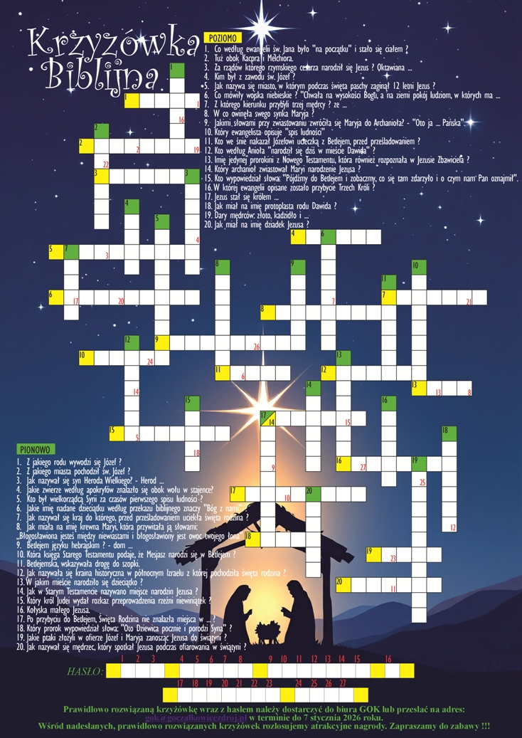 Poprawnie rozwiązane krzyżówki (hasło + odp. na wszystkie pytania) należy dostarczyć do biura GOK-u lub przesłać na adres mailowy: gok@goczalkowicezdroj.pl w terminie do 7 stycznia 2026 r.