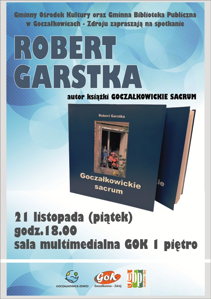 Gminny Ośrodek Kultury oraz Gminna Biblioteka Publiczna zapraszają na wyjątkowe spotkanie z Panem Robertem Garstką, autorem książki "Goczałkowickie sacrum". Publikacja, która jest pierwszą od kilku lat pozycją o naszej gminie przybliża czytelnikowi historię małej architektury sakralnej naszej pięknej miejscowości. Promocja książki odbędzie się w siedzibie goczałkowickich instytucji kultury w piątek 21 listopada, o godz. 18.00.